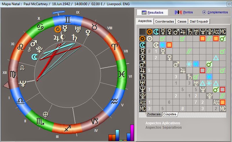 Com o mapa das 02:00, o Sol de Paul está na Casa IV (família, antepassados, lar) e o Meio do Céu está em Sagitário, vazio de planeta, com o regente Júpiter na Casa IV… e no mapa das 14:00, o Sol e Júpiter estão na Casa X e juntinho ao Meio do Céu, o que é mais condizente com um sujeito que saiu do anonimato para ser um dos mais conhecidos e bem-sucedidos músicos de todos os tempos. Então, vamos com o mapa das 14:00!