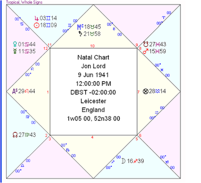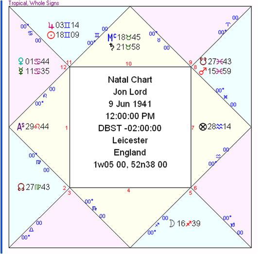 E Jonathan Douglas Lord nasceu em Leicester (Inglaterra), em 9 de junho de 1941, sem horário registrado (ou pelo menos divulgado), o que nos impede de ver a distribuição dos signos e planetas pelas Casas do seu mapa – e consequentemente as dignidades acidentais – mas podemos ver as dignidades essenciais dadas pela posição dos planetas nos signos.